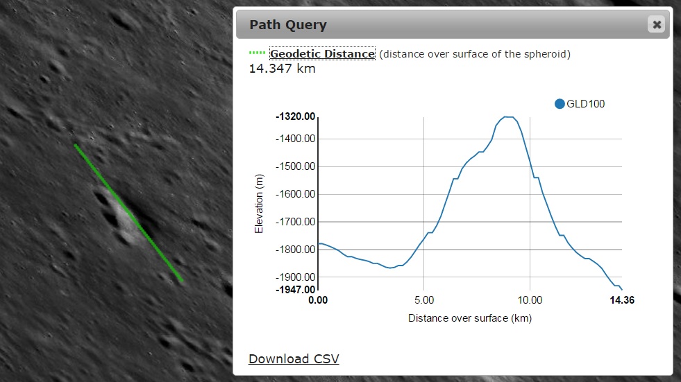 Imagem: O perfil altimétrico NW - SE da pequena e clara montanha e disposta em curva - NASA / LRO QuickMap.
