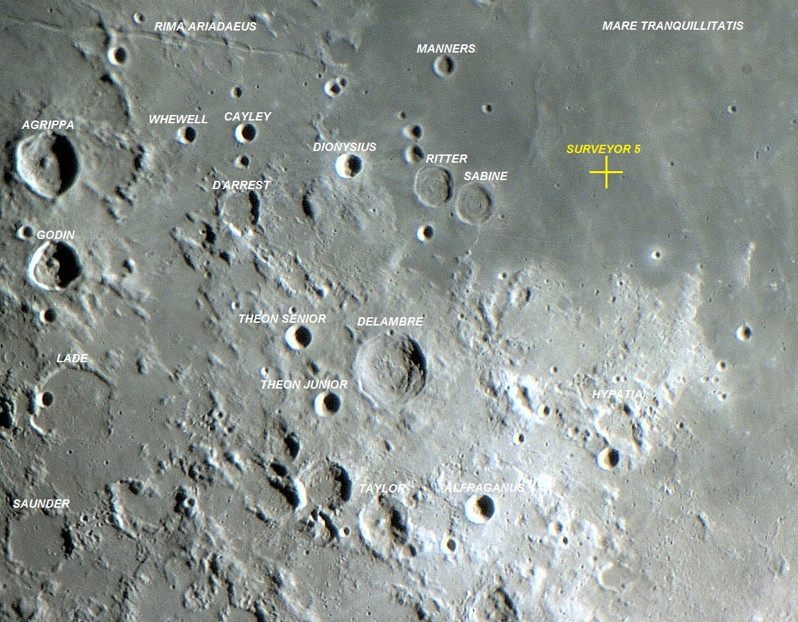 A sonda lunar Surveyor 5 pousou suavemente no Mare TRANQUILLITATIS, em 11 de setembro de 1967, às 00:46:44 UT, próximo do futuro local de alunissagem da futura missão Apollo 11 (primeira alunissagem tripulada), nas coordenadas selenográficas LAT: 01° 24′ 36″ N, LON: 023° 10′ 48″ E. Essa sonda executou testes químicos na superfície lunar e enviou mais de 18.000 fotos para a Terra.
