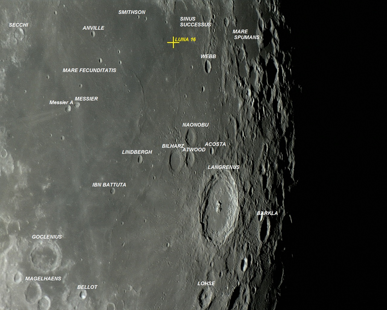 A sonda soviética Luna 16 alunissou suavemente em 20 de setembro de 1970, às 05:18:00 UT, nas coordenadas selenográficas LAT: 00°41'00" S e LON: 56°18' 00" E, próximo da margem norte do MARE FECUNDITATIS, na região do SINUS SUCCESSUS.