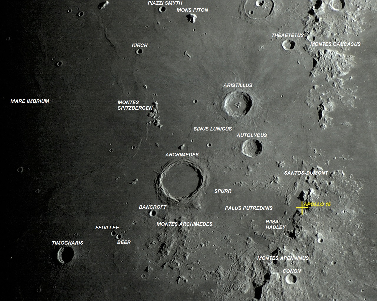 Foto: Local de alunissagem da missão Apollo 15, próximo ao canal sinuoso Rima HADLEY, na margem leste do Mare IMBRIUM e na base da cordilheira dos Montes APENNINUS, a cerca de 60 Km da cratera SANTOS-DUMONT, que está na direção nordeste. Foto executada com apenas 1 frame em 20 de junho de 2010, 19:31:54, (22:31:54 UT).