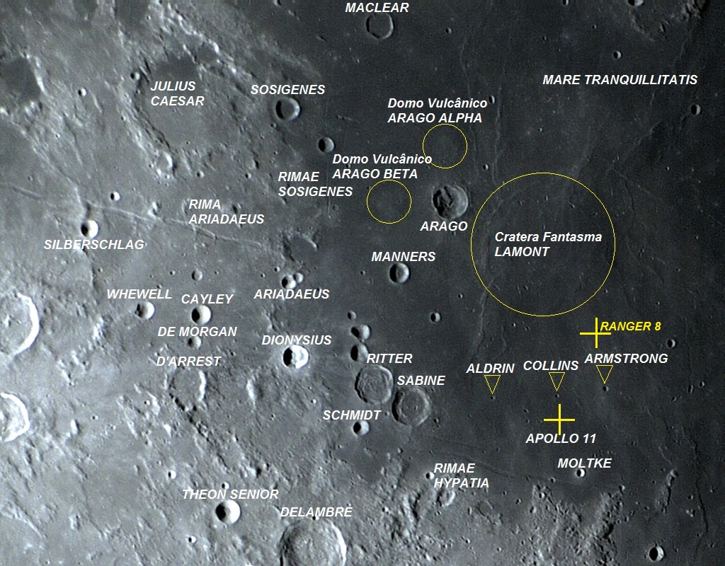 Foto: Uma visão ampla da região que foi alvo da alunissagem da missão Apollo 11, mostrando algumas crateras de interesse. O pouso suave da primeira missão tripulada na superfície lunar, aconteceu no Mare TRANQUILLITATIS, nas coordenadas selenográficas LAT: 00° 40′ 26.69″ N, LON: 23° 28′ 22.69″ E, em 20 de julho de 1969, às 20:17:40 UT. Na direção oeste do local do pouso, encontram-se as crateras SABINE e RITTER, que formam um interessante par, com aproximadamente a mesma idade e tamanho. Ambas têm cerca de 3,8 milhões de anos. SABINE possui 31 Km de diâmetro e 1,5 Km de profundidade, enquanto RITTER tem 32 Km de diâmetro e 1,3 Km de profundidade. Ambas possuem piso áspero, mas sem pico central. A noroeste do local de alunissagem encontra-se a cratera ARAGO, com 27 Km de diâmetro e 1,8 Km de profundidade. Na direção sudeste do pouso localiza-se a jovem e pequena cratera MOLTKE, com 6,5 Km de diâmetro e 1,3 Km de profundidade.Foto executada em 22 de fevereiro de 2011, 02:28:50, por VTOL.