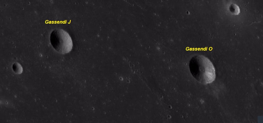 As crateras Gassendi J (diâmetro: 9Km, profundidade: 1,98 m) e Gassendi O (diâmetro: 10 Km, profundidade: 2,11 m), caracterizam-se como destacadas formações perfeitamente circulares, localizadas isoladamente numa superfície de aspecto liso e plano, criada pelas lavas escuras do Mare HUMORUM. Gassendi J localiza-se nas coordenadas selenográficas LAT: 21° 37′ 12″ S, LON: 037° 06′ 00″ W. Gassendi O localiza-se nas coordenadas selenográficas LAT: 21° 57′ 36″ S, lon: 035° 07′ 48″ W.