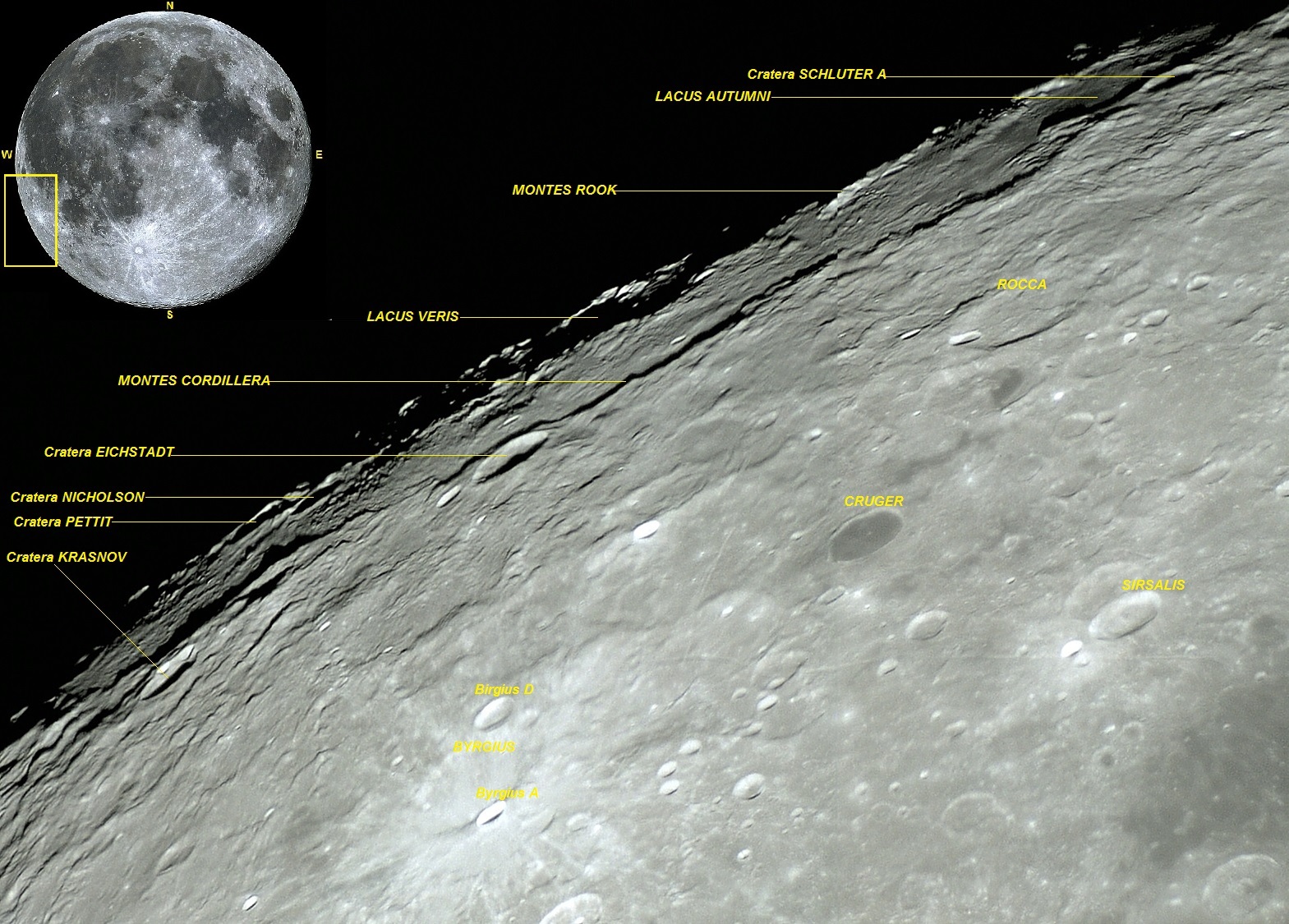 Mare ORIENTALE é uma enorme formação circular, caracterizada como uma bacia de impacto, estruturada internamente com dois anéis concêntricos de montanhas (Montes ROOK e Montes CORDILLERA), sendo parcialmente inundado por lava escura. Mare ORIENTALE se estende por aproximadamente 930 Km pela superfície da borda extrema oeste-sudoeste da Lua, na zona de librações, sendo de difícil visualização a partir do nosso ponto de vista aqui da Terra. Mare ORIENTALE é considerada a mais jovem bacia de impacto da Lua. Estima-se que o impacto do asteróide ou cometa que criou essa enorme formação, tenha ocorrido há cerca de 3.8 bilhões de anos.