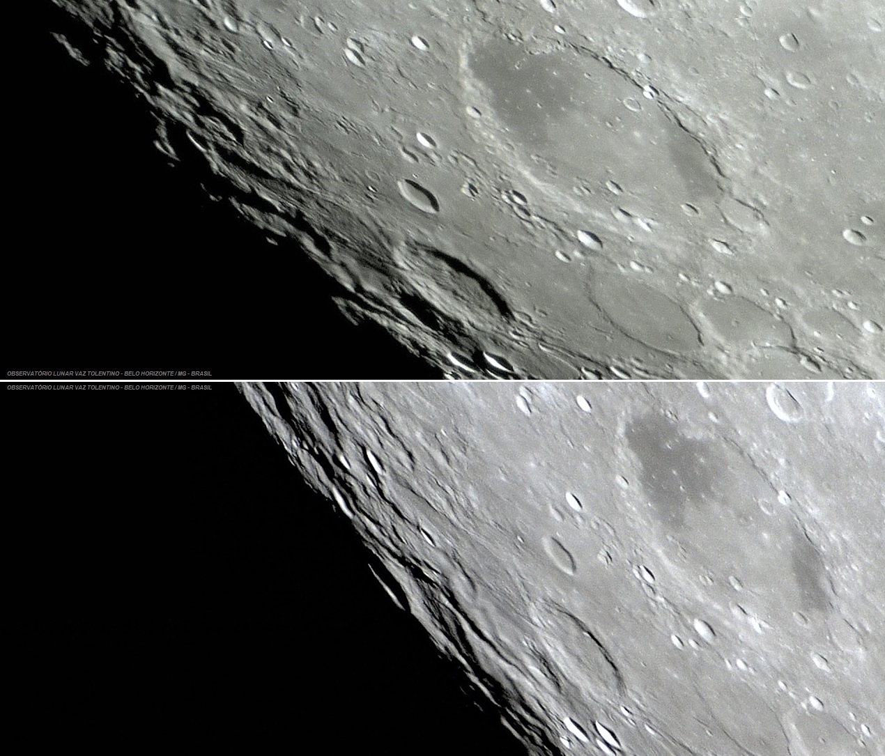 Foto: Composição fotográfica mostrando a grande cratera SCHICKARD, localizada no quadrante sudoeste lunar, em dois momentos. Note o aspecto visual “zebrado” ou “camuflado” de seu amplo piso interno. A foto da esquerda foi executada em 03 de julho de 2012, 01:12:44 e a foto da direita em 02 de julho de 2012, 00:29:14. Fotos executadas com apenas 1 frame por VTOL.
