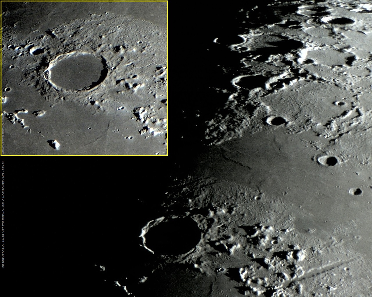Foto: Composição fotográfica mostrando a proeminente cratera PLATO em dois momentos, com as longas sombras dos altos e baixos do perfil de seu aro, que se estendem por todo o piso interno da cratera, criando um belo espetáculo visual. No detalhe da esquerda, no entardecer lunar em PLATO, as sombras são produzidas com a luz do Sol a oeste em ângulo oblíquo. Na direita, no amanhecer lunar em PLATO, as sombras são produzidas com a luz do Sol a leste em ângulo oblíquo. Fotos executadas com apenas 1 frame cada por VTOL em 27 de março de 2011, 05:43:10 e 11 de novembro de 2013, 22:06:33.
