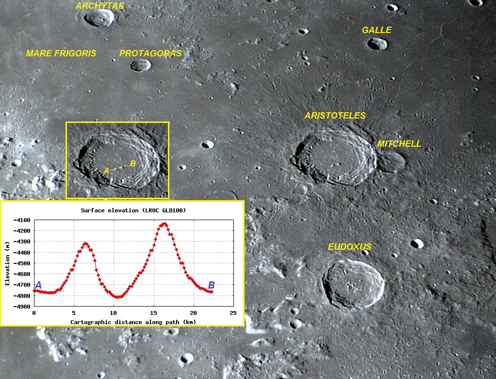 ARISTOTELES é uma bela cratera de impacto de morfologia complexa, relativamente nova, que faz um destacado par com a cratera EUDOXUS.
