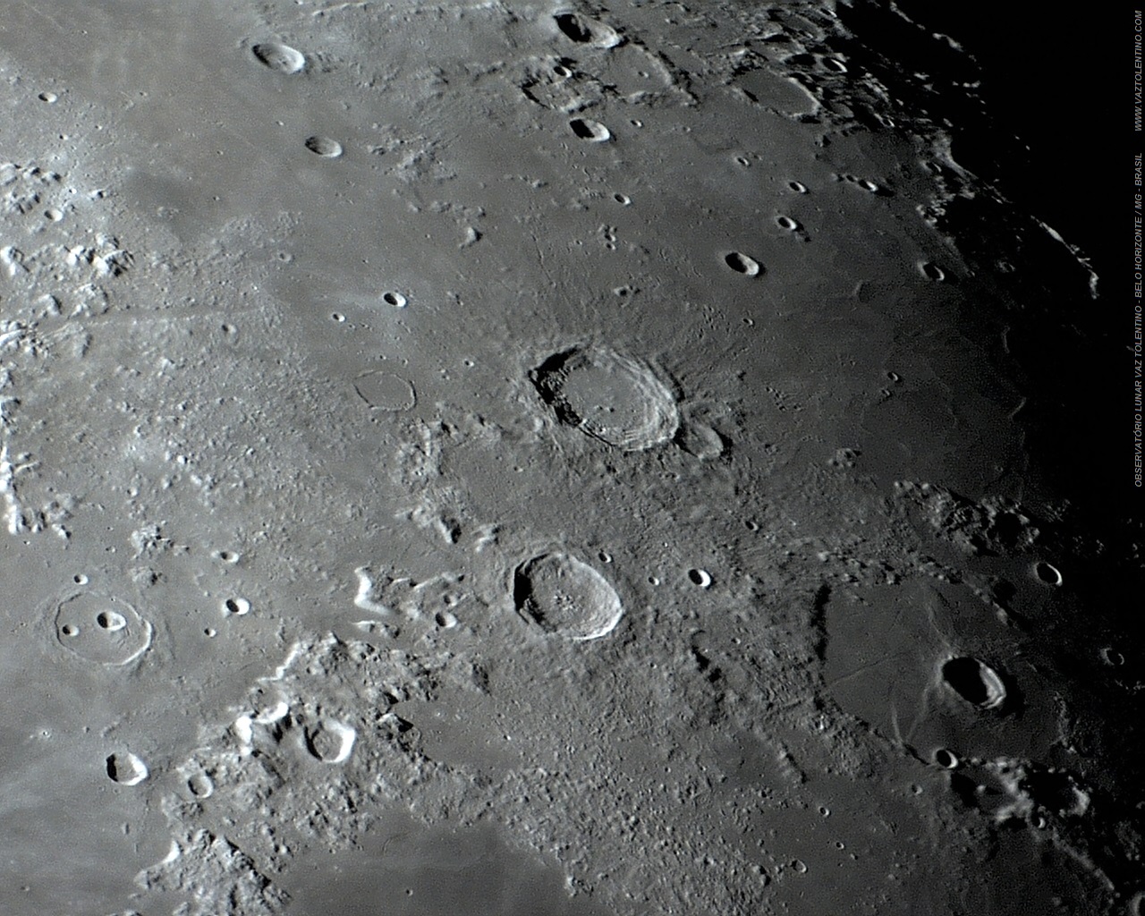 Foto: O belo par de crateras ARISTOTELES e EUDOXUS. A leste vê-se o Lacus MORTIS e, em seu interior, a cratera BÜRG. Foto executada por VTOL em 22 de fevereiro de 2011, 02:31:08.