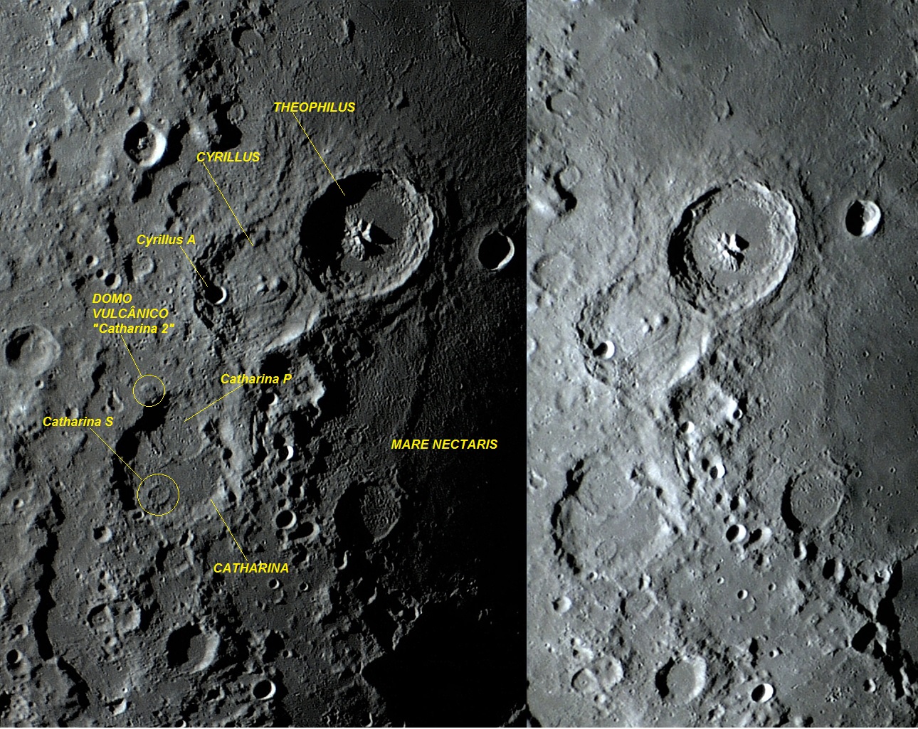 Foto: Composição apresentando o trio de crateras THEOPHILUS, CYRILLUS e CATHARINA em dois momentos. A foto da esquerda foi executada em 11 de abril de 2012, 02:37:32 e a foto da direita foi executada em 22 de fevereiro de 2011, 02:27:00. Fotos por VTOL.