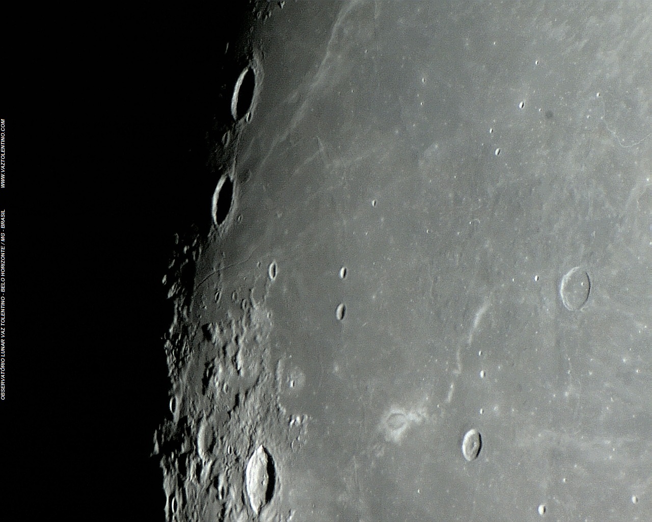 Abaixo, foto da pequena cratera de impacto GALILAEI (diâmetro: 15,5 Km, profundidade: 1,4 Km, coordenadas selenográficas: LAT: 10° 30′ 00″ N, LON: 62° 42′ 00″ W). Com certeza uma formação lunar muito pequena para homenagear o grande cientista que foi Galileo Galilei (1564 – 1642). Foto executada com apenas 1 frame em 12 de maio de 2014, 22:26:04.