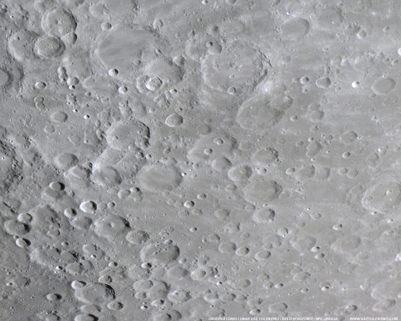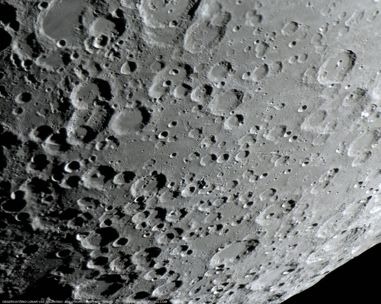 A foto de hoje mostra um exemplo de “terras altas” ou planaltos, próximo do polo sul lunar, no quadrante sudeste da Lua. Essa região é muito antiga, elevada, clara e cravejada por inúmeras crateras de impacto, que guardam os registros da interessante história lunar e da evolução do Sistema Solar.