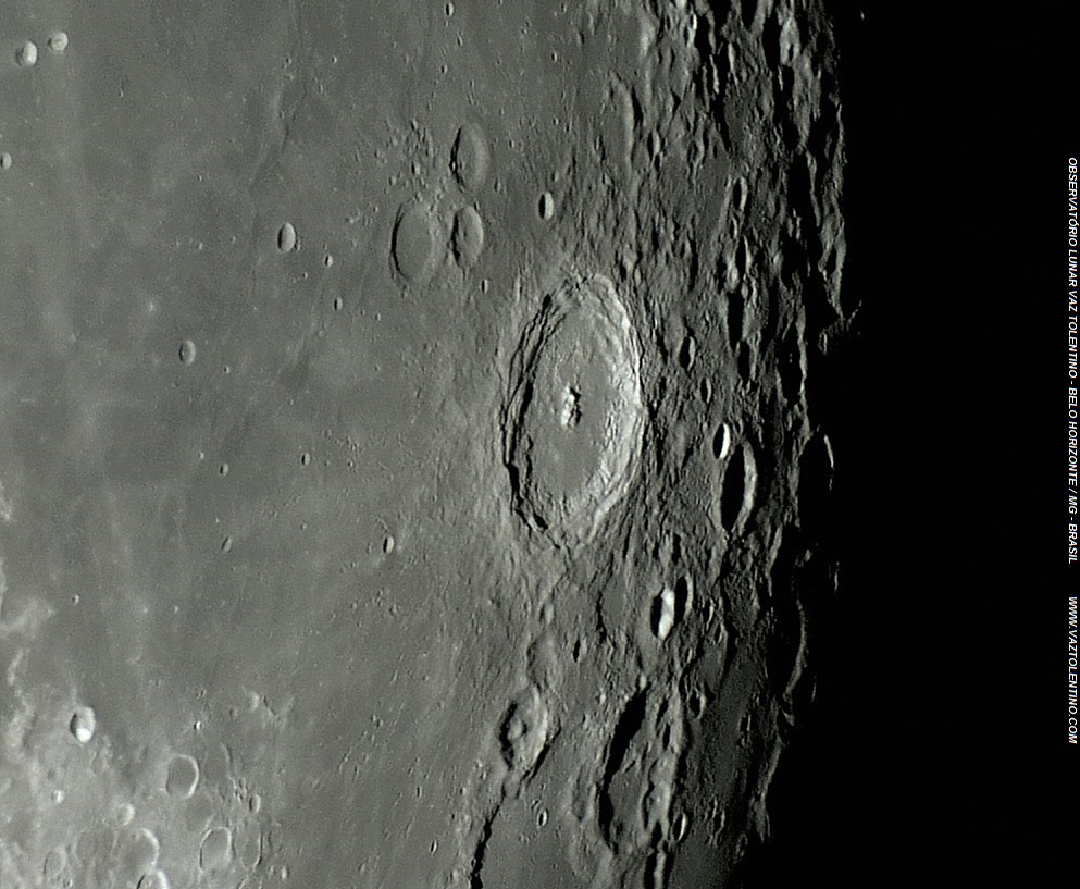 Foto: Quando a luz solar vem em ângulo raso a partir do oeste (entardecer lunar) as montanhas centrais de LANGRENUS produzem duas belas e longas sombras, que percorrem toda a metade leste do piso interno dessa destacada cratera. Foto executada por VTOL em 10 de março de 2012, 01:10:30 (04:10:30 UT).