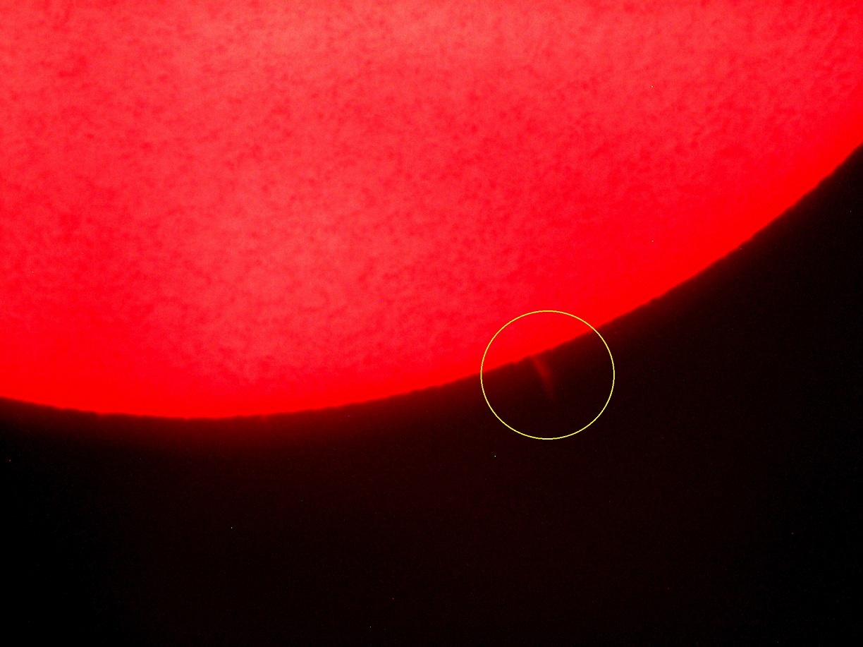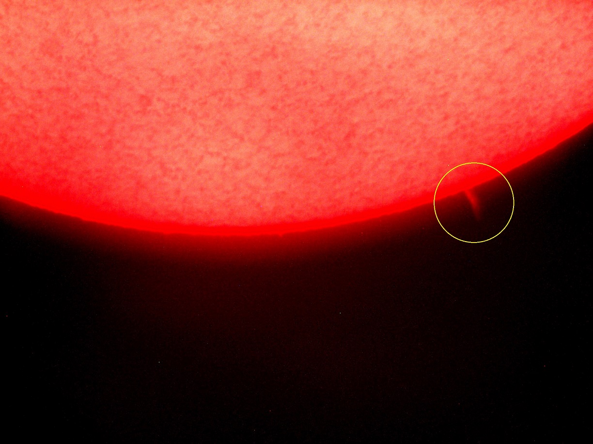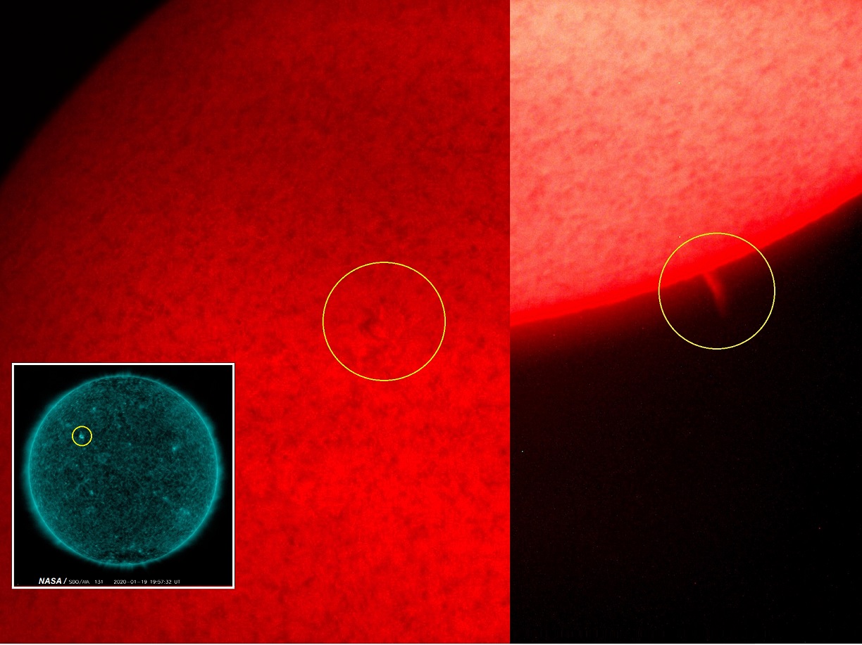Foto executada com apenas 1 frame em 19 de janeiro de 2020, 13:52:42 (16:52:42 UT), utilizando filtro DayStar Filters QUARK H-Alpha Eyepiece Solar Filter (Chromosphere), Telescópio Refrator APO Tele Vue 85, Tripé GSO SkyView Deluxe Alt-Az Mount, Câmera Orion StarShoot 3mp Solar System V Imaging Camera .Orion 0.5x Focal Reducer.