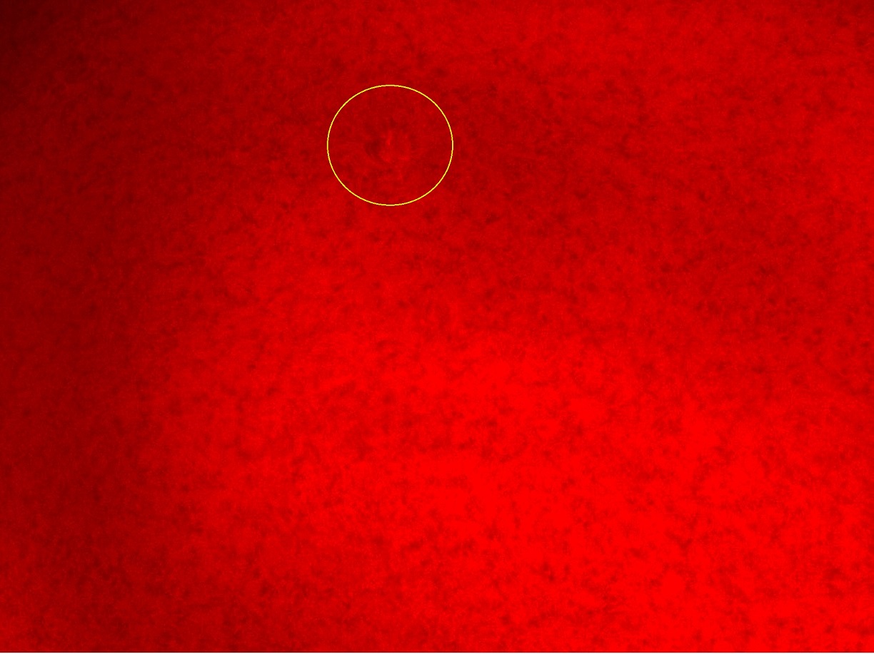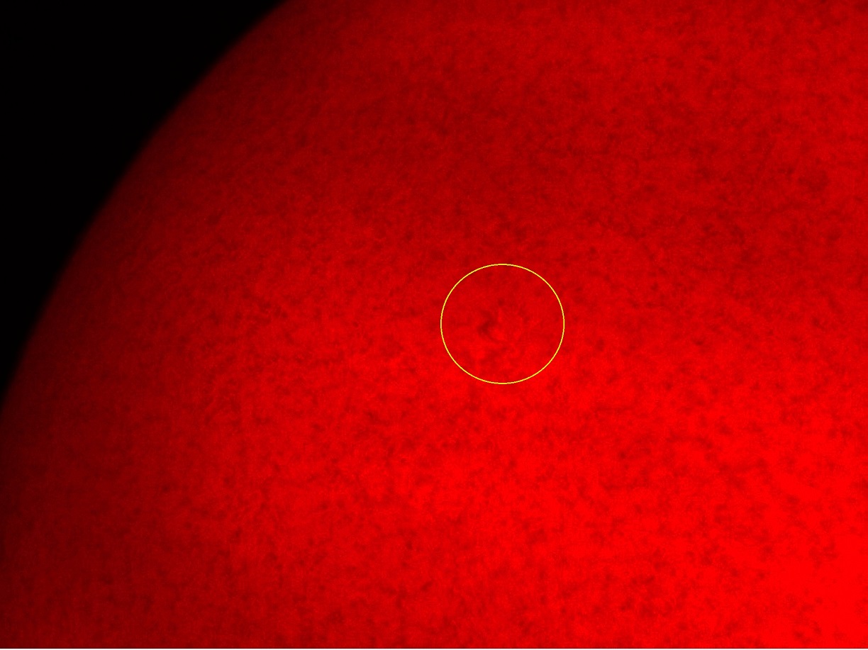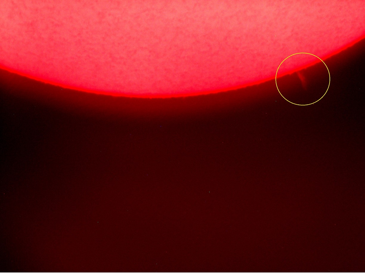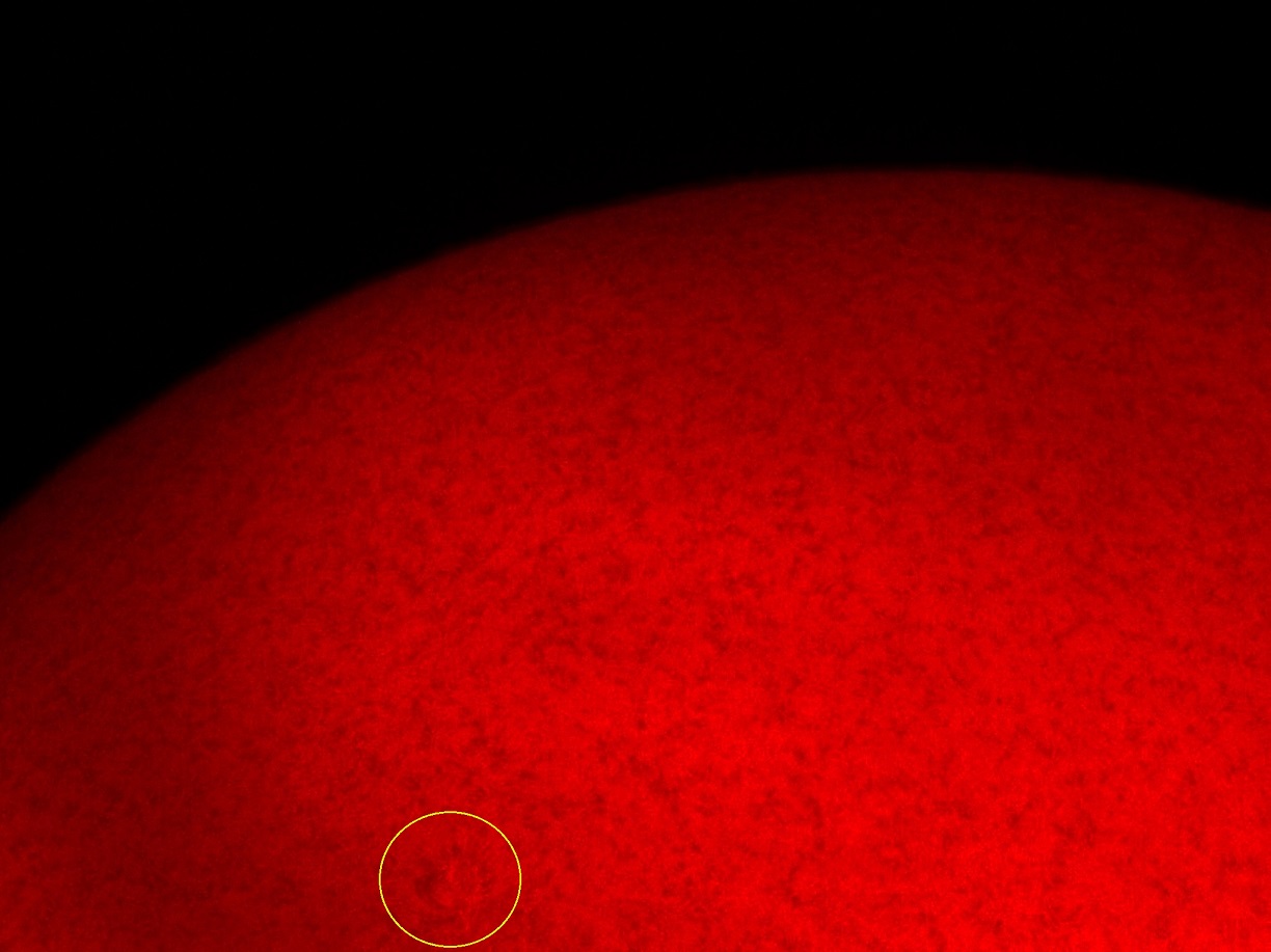 Porém, fazendo um teste de imagens hoje (19/01/2020), utilizando o telescópio refrator APO Tele Vue 85, com um novo filtro solar H-Alpha e uma nova câmera planetária / redutor focal 0.5X, verifiquei a existência de um pequeno "flare" e uma pequena proeminência.