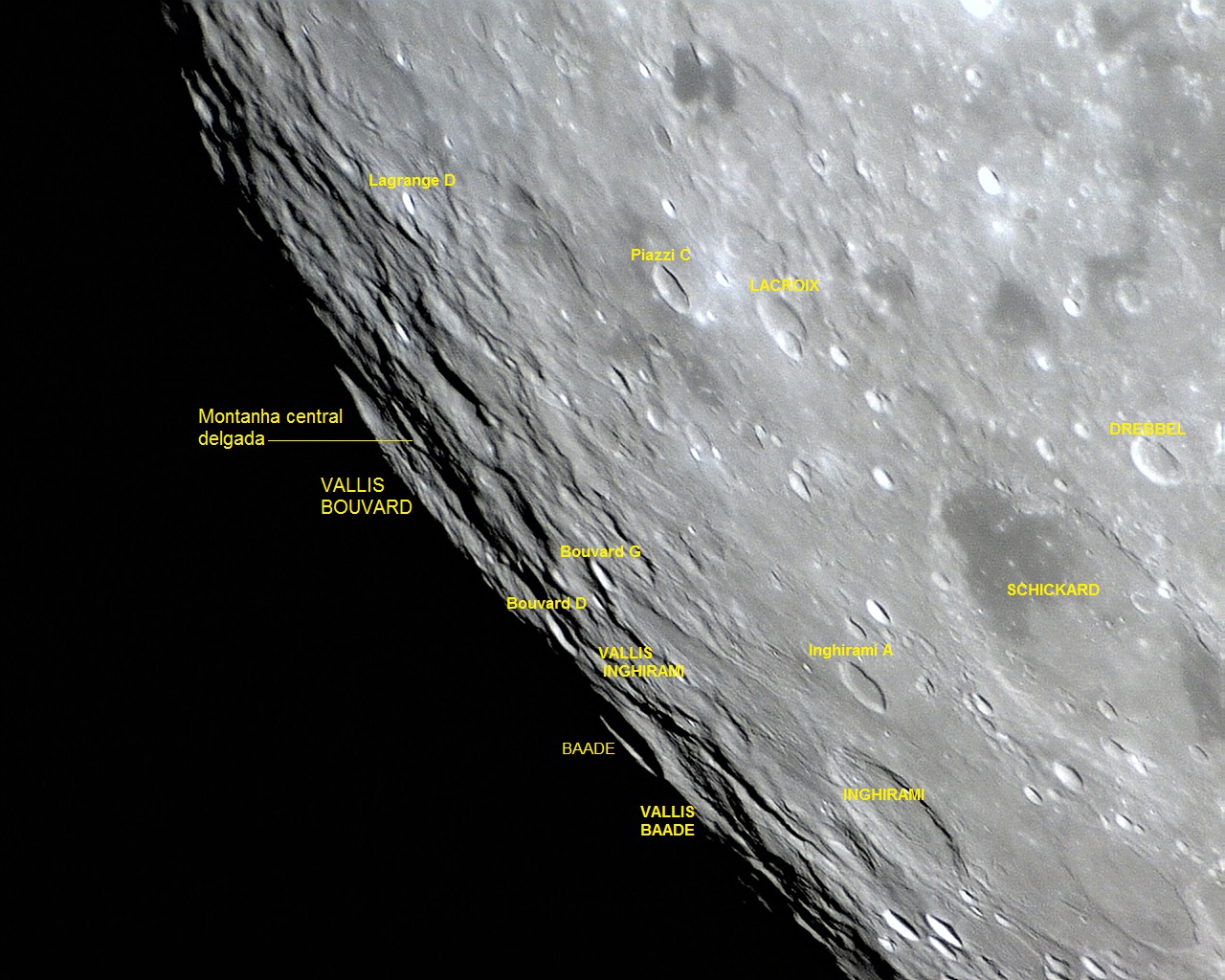 Vallis BOUVARD é uma grande e comprida depressão irregular, localizada de forma embutida entre elevadas e proeminentes muralhas, próximo do limbo lunar sudoeste, nas coordenadas selenográficas LAT: 38.3° S, LON: 83.1° W. Esse grande vale longitudinal, de aproximadamente 284 Km de comprimento, apresenta uma delgada montanha central. Em 1970 a International Astronomical Union - IAU nomeou essa interessante formação lunar para homenagear astrônomo e matemático francês Alexis Bouvard (1767 - 1843).