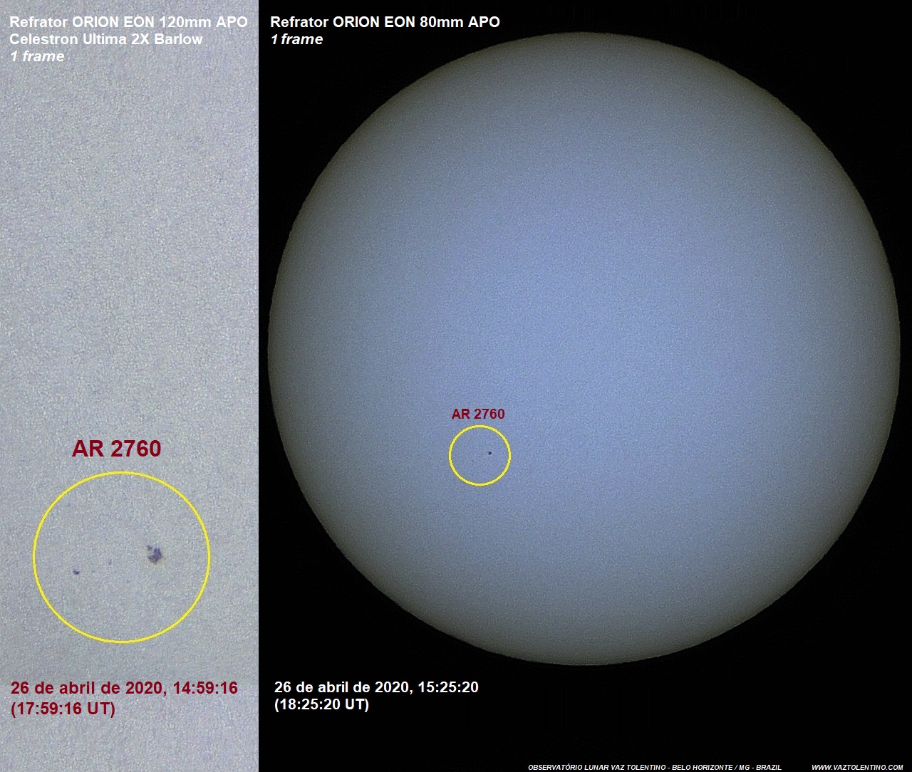 Os Telescópios Refratores Apocromáticos equipados com filtros luz branca (fotosfera) Baader, utilizados para capturar as imagens da região ativa AR 2760 com apenas 1 frame (ORION EON 120mm APO e ORION EON 80mm APO).