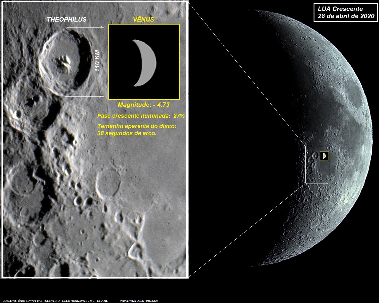 Composição fotográfia montada com fotos executadas com apenas 1 frame: THEOPHILUS, CYRYLLUS e CATHARINA (28 de abril de 2020, 18:22:00 / 21:22:00 UT), LUA Crescente (28 de abril de 2020, 18:45:36 / 21:45:36 UT), VÊNUS Maior (28 de abril de 2020, 18:11:06 / 21:11:06 UT), VÊNUS Menor (28 de abril de 2020, 18:46:56 / 21:46:56 UT).