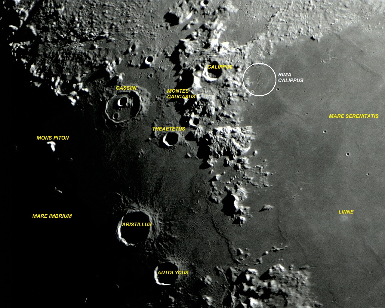A cerca de 50 Km a sudeste da cratera CALIPPUS (diâmetro: 32 Km, profundidade: 2,7 Km), na base da cordilheira dos Montes CAUCASUS e nas lavas escuras da margem noroeste do Mare SERENITATIS, está localizado um destacado e isolado canal, de características que indicam ser do sinuoso (porém também arqueado), como se fosse um leito de rio seco, conhecido como Rima Calippus.