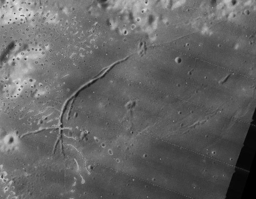 Imagem: Rima Calippus fotografada em voo orbital pela sonda lunar robótica americana Lunar Orbiter V da NASA.