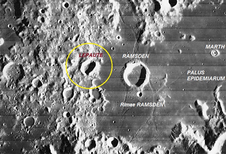 LEPAUTE está localizada nas coordenadas selenográficas LAT: 33° 18′ 00″ S, LON: 033° 36′ 00″ W, junto da borda oeste do PALUS EPIDEMIARUM (pântano da epidemia), a cerca de 20 Km a oeste da cratera RAMSDEN (diâmetro: 25 Km, profundidade: 1,9 Km). A cratera RAMSDEN situa-se na área que contém um sistema de canais conhecido como Rimae RAMSDEN.