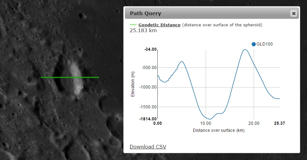 ImagemO perfil altimétrico W - E da cratera LEPAUTE - NASA / LRO QuickMap.