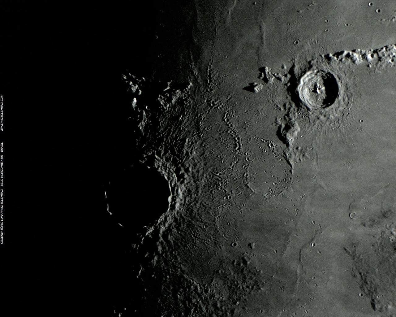 Foto: Pouco antes das fases quarto crescente e quarto minguante, COPERNICUS fica inteiramente preenchida por sombra negra, parecendo um grande buraco sem fundo. A foto mostra também as inúmeras crateras secundárias criadas pelos escombros ejetados pelo impacto que criou COPERNICUS. Foto executada por VTOL em 29 de maio de 2012, 20:10:10.