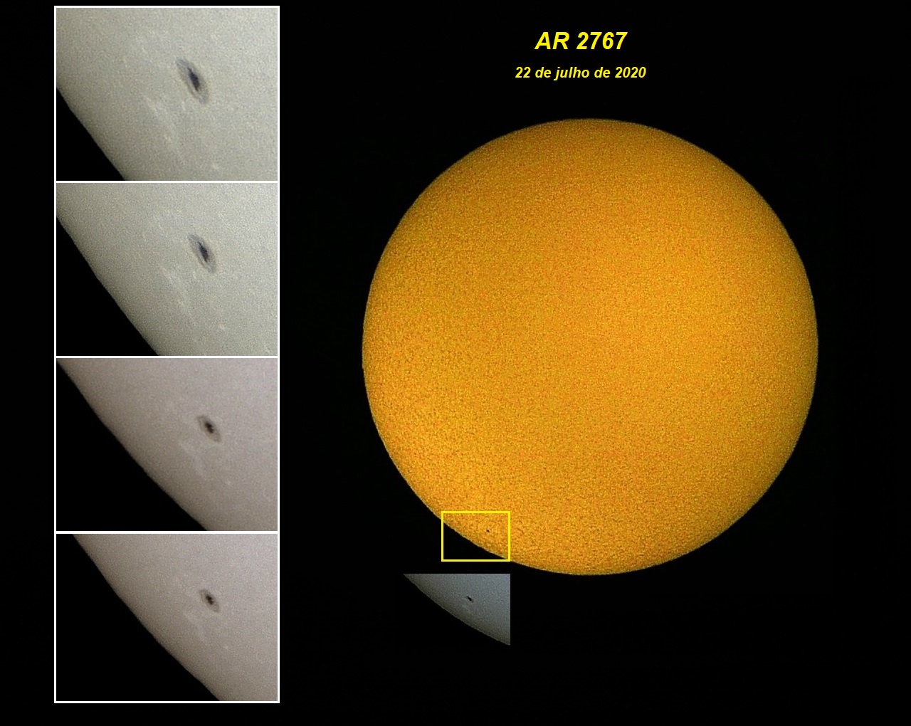 A nova Região Ativa de Manchas Solares AR 2767 surgiu ontem, 21 de julho de 2020, no limbo do quadrante sudeste do hemisfério visível do Sol, apresentando tamanho de 80 MH ou 243,2 milhões de km2 (1 MH corresponde a 3,04 milhões de Km2).