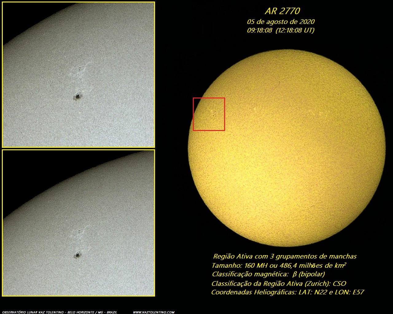 Fotos do Sol enfocando a Região Ativa AR 2770 em 05 de agosto de 2020, 09:18:08 (12:18:08 UT).