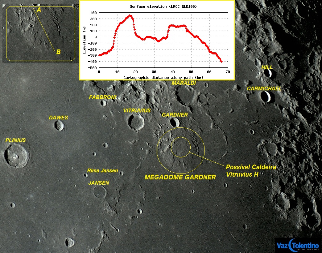 Gardner Megadome é uma formação incomum, que consiste numa enorme área elevada localizada ao sul da cratera Gardner (diâmetro: 18 Km, profundidade: 3,0 Km) que, possivelmente, seria uma grande formação vulcânica, com uma grande depressão no topo com indícios de ser uma caldeira vulcânica, conhecida como cratera Vitruvius H (diâmetro: 22 Km, profundidade: 400 m). Segundo as medições da altimetria a laser da sonda americana LRO da NASA, a provável caldeira possui aproximadamente 20 Km de diâmetro médio e cerca de 450 m de profundidade máxima.