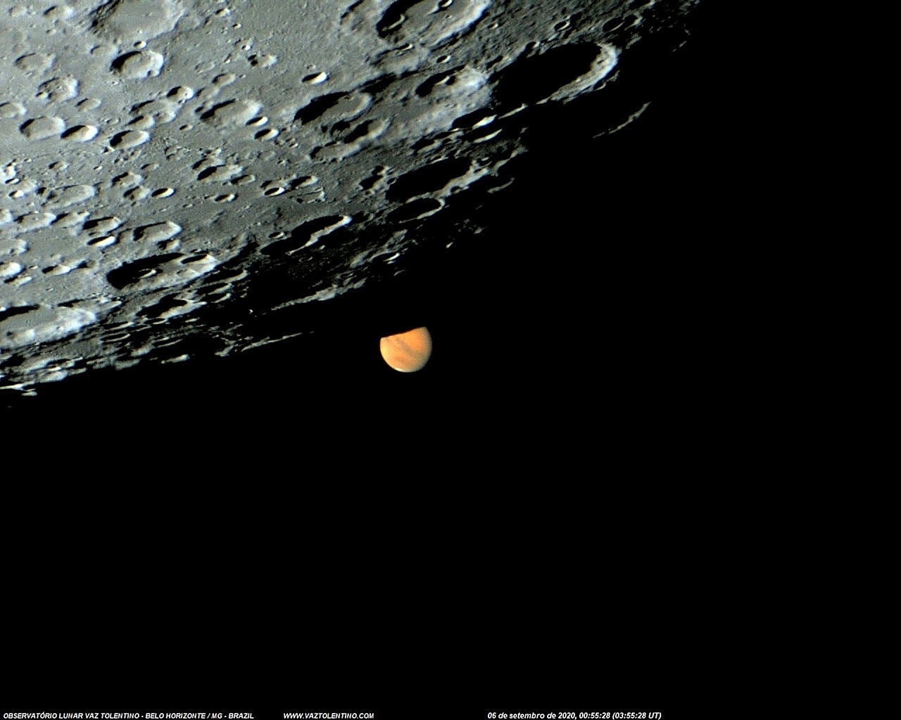 Do nosso ponto de vista no Observatório Lunar Vaz Tolentino em Belo Horizonte (LAT: 19o 55’ 40.6” S, LON: 043o 55’ 04.1” W, ALT: 898m), o reaparecimento de Marte teve início às 00:53:24 (03:53:24 UT), no limbo lunar sudeste, na região da cratera de impacto HELMHOLTZ (diâmetro: 94 km, profundidade: 4,4 km).