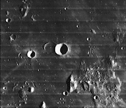 Imagem: A Cratera TURNER e sua companheira fantasma fotografada pela sonda lunar americana Lunar Orbiter / NASA. A Cratera Turner F também aparece na foto.