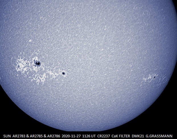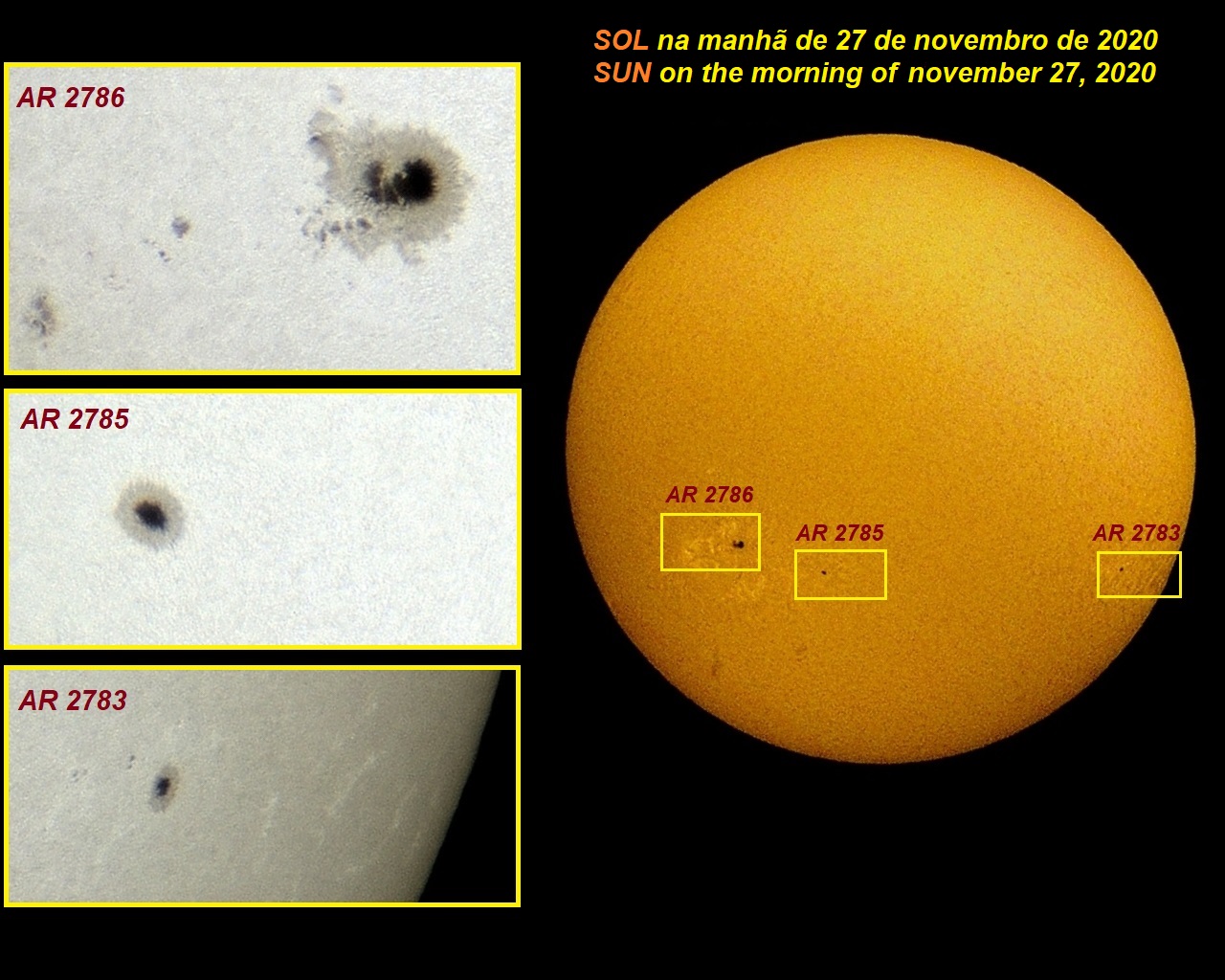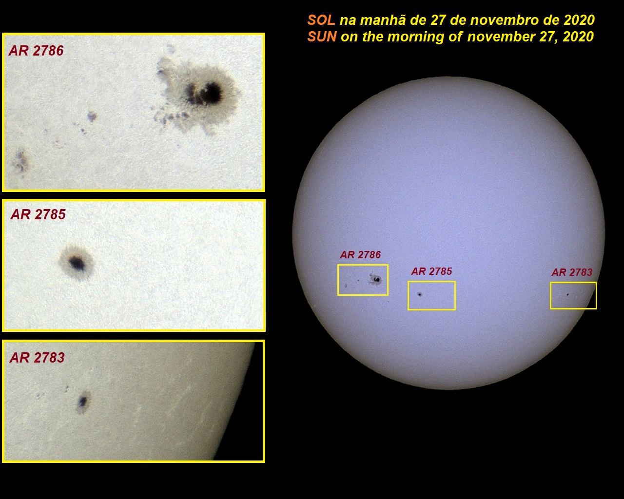 Na manhã de 27 de novembro de 2020, o SOL apresentava três regiões ativas de manchas solares em destaque no seu hemisfério visível. Tais regiões ativas, pertencentes ao ciclo solar 25 que teve seu início em dezembro de 2019, estavam rodeadas por fáculas e foram protagonistas de muitas erupções: