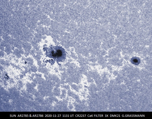 Imagem: A grande região ativa AR2786 e sua companheira, a AR 2785. Foto executada com apenas 1 frame (filtro Baader luz visível) em 27 de novembro de 2020, 10:02:34 (13:02:34 UT).