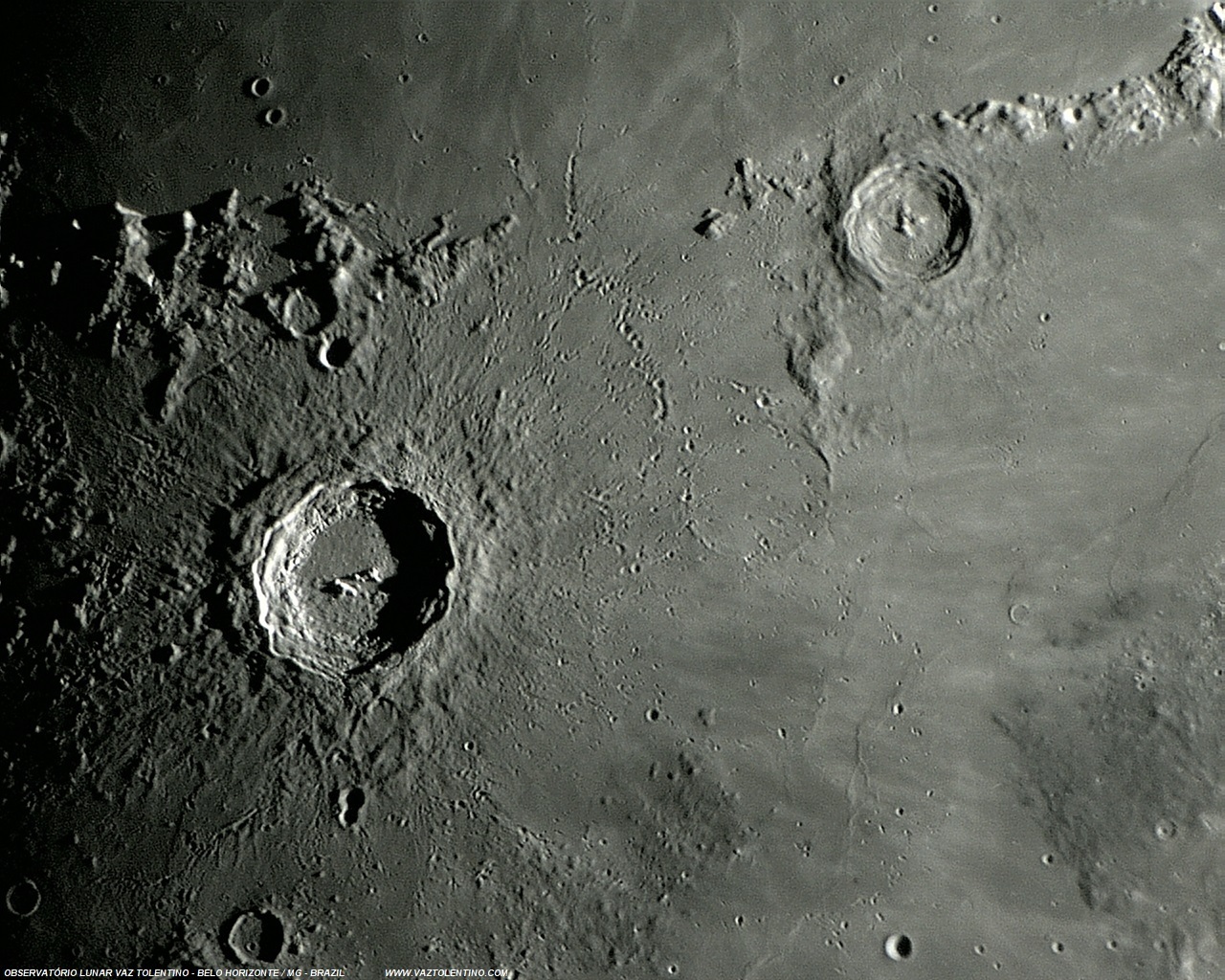 Foto: Pouco antes das fases quarto crescente e quarto minguante, COPERNICUS fica inteiramente preenchida por sombra negra, parecendo um grande buraco sem fundo. A foto mostra também as inúmeras crateras secundárias criadas pelos escombros ejetados pelo impacto que criou COPERNICUS. Foto executada por VTOL em 29 de maio de 2012, 20:10:10.