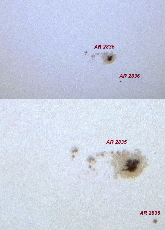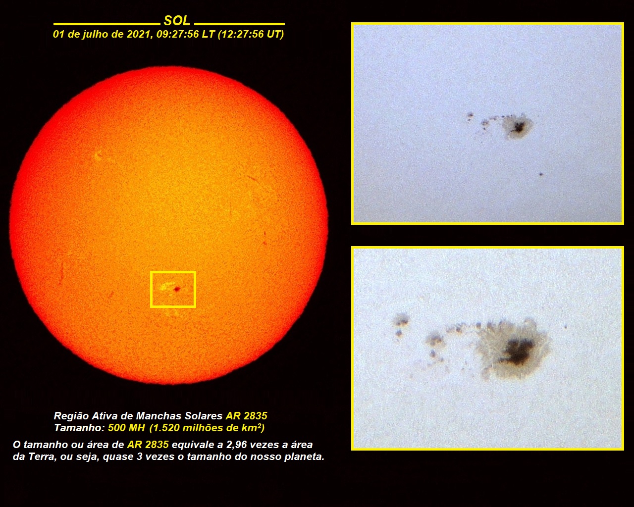 Nesta oportunidade damos destaque à Região Ativa AR 2835 e seu grupamento de manchas solares com área de grande abrangência (500 MH ou 1.520 milhões de km2), equivalente a quase 3 vezes a área do planeta Terra.