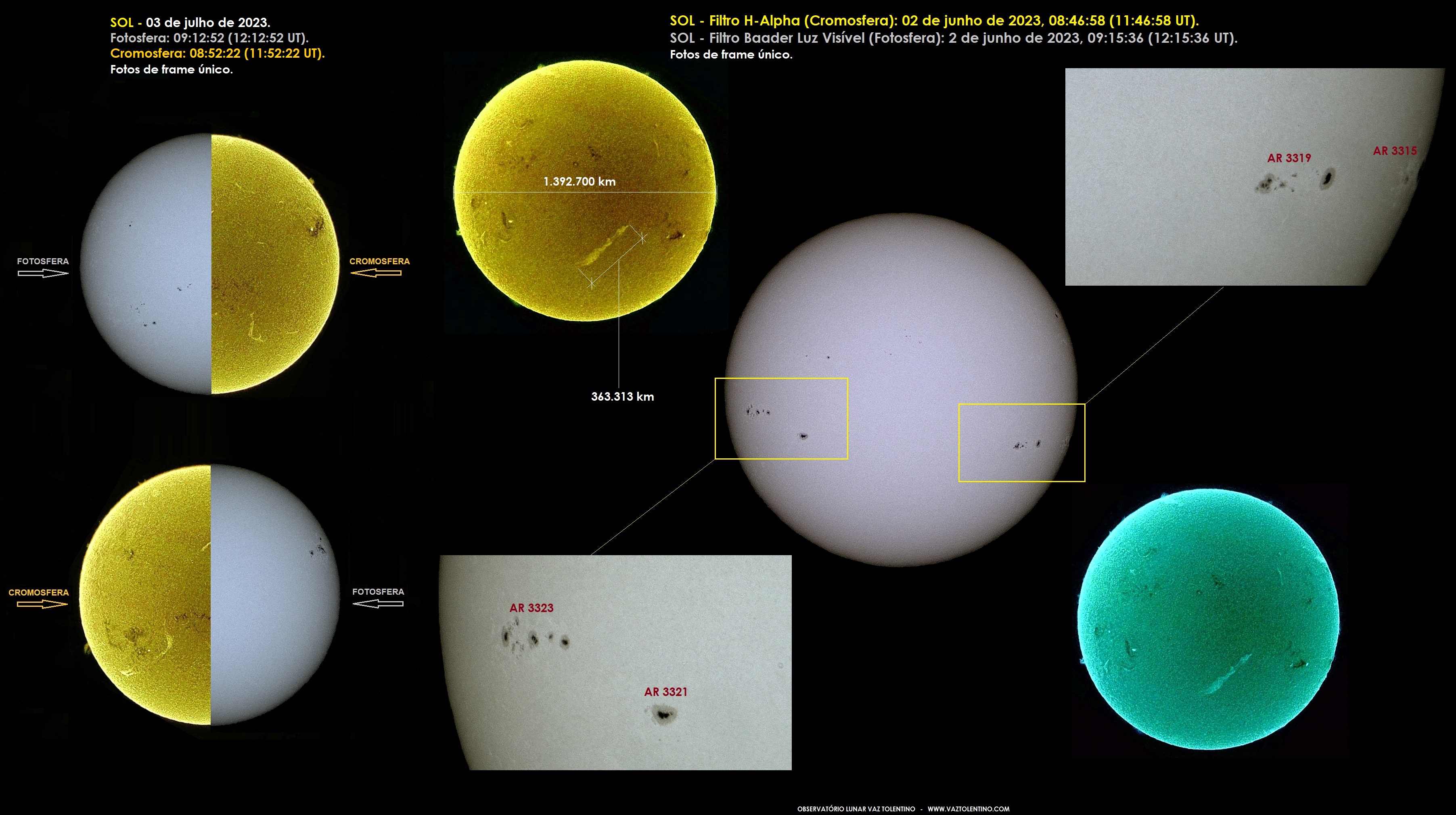 Composição com fotos de frame único (cromosfera e fotosfera) em 03/07/2023 e 02/06/2023.