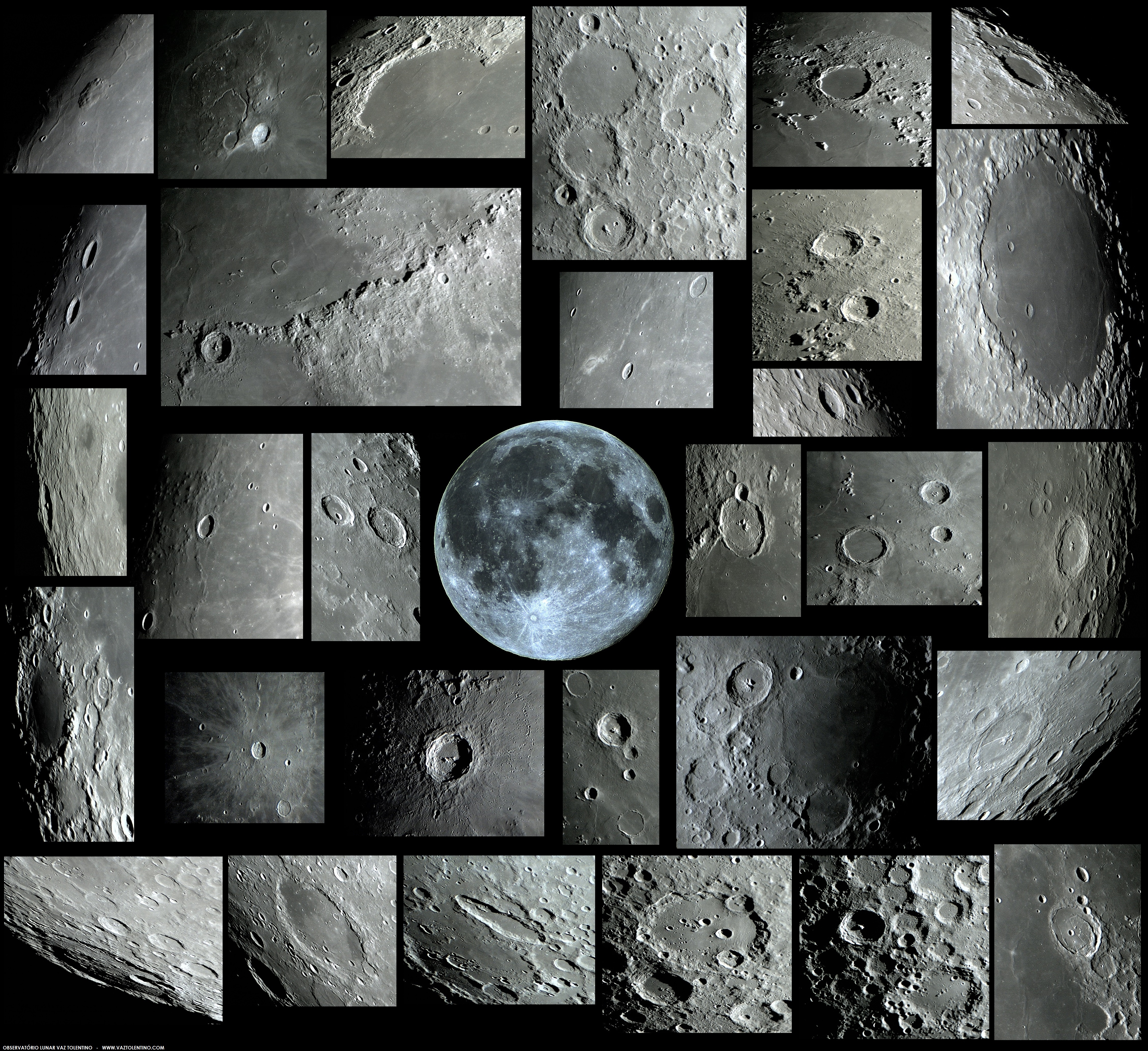 Você gosta de Selenografia? Você consegue identificar as formações lunares presentes nesta composição fotográfica e dizer os nomes de todas elas? As imagens foram feitas no Observatório Lunar com a técnica do frame único, em diferentes épocas.