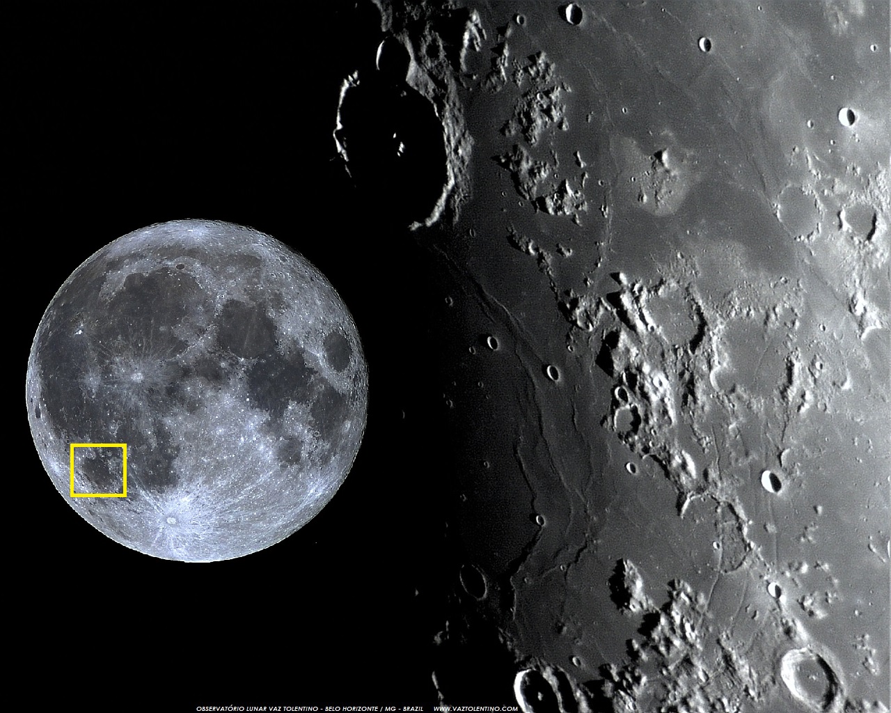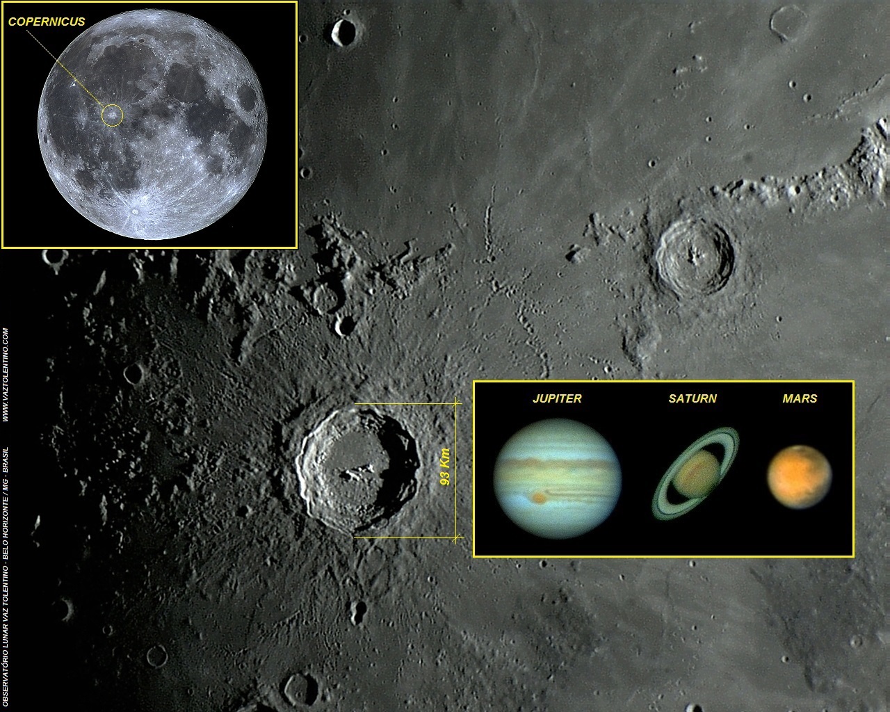 – A Lua é um alvo enorme quando comparada, a partir do nosso ponto de vista aqui da Terra, com outros corpos celestes, como por exemplo, os planetas. É importante notar que JÚPITER, o maior planeta do Sistema Solar, quando observado da Terratem aproximadamente o mesmo diâmetro angular da cratera COPERNICUS. Para se ter uma noção mais prática, COPERNICUS tem 96 Km de diâmetro e a Lua tem 3.476 Km. Por isso, nosso satélite natural é um enorme território extraterrestre a ser explorado, mantendo muitas surpresas para serem descobertas.